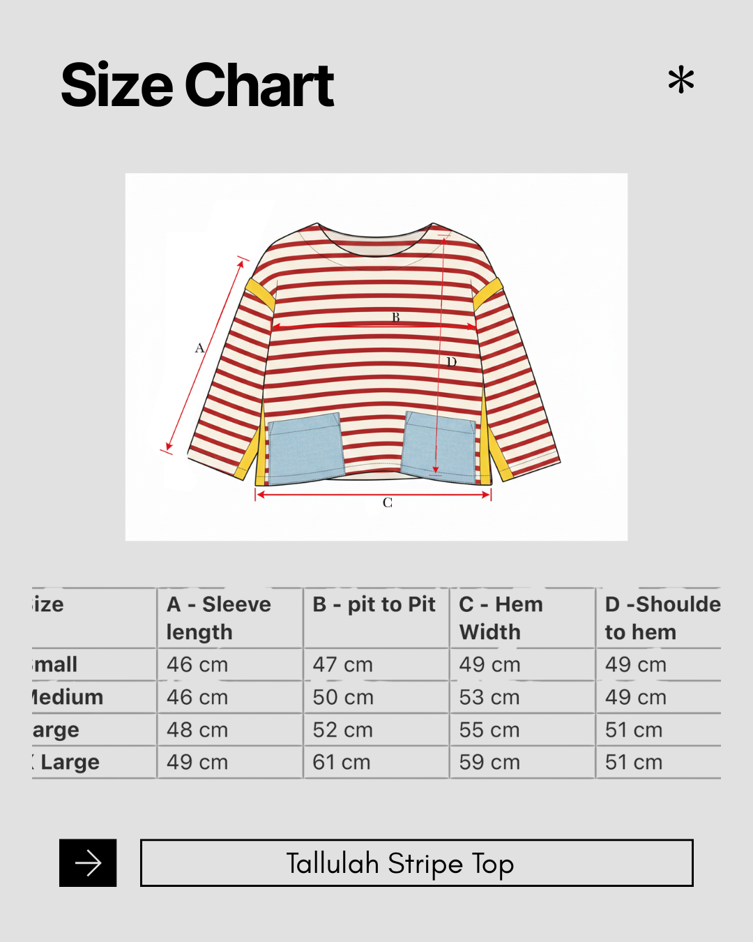A playful reimagining of the classic Breton, crafted in red stripes with vibrant yellow seam binding. Light denim patch pockets add contrast and texture, while the cropped, wide silhouette creates a beautiful swing. Designed to pair perfectly with high-waisted bottoms—try it with our cream moleskin Celeste culottes. This style runs small, so we recommend sizing up to achieve the intended shape.